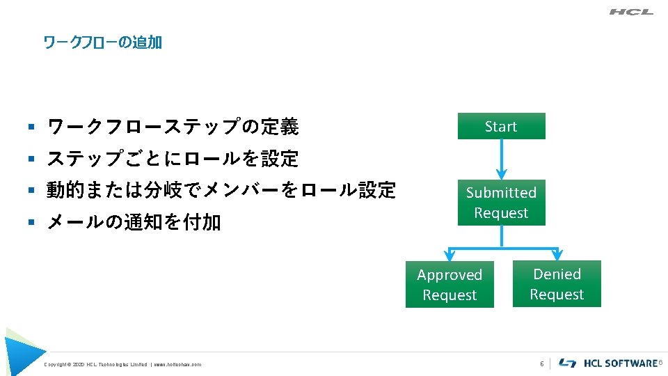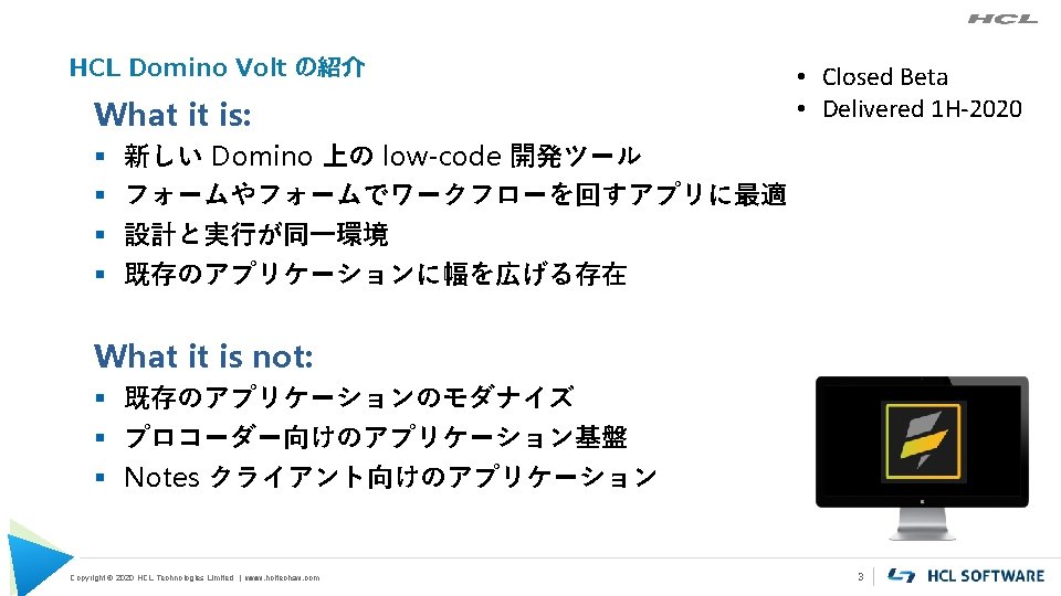 HCL Domino Volt 2020 27 2019 HCL Technologies Slides: 9 Download presentation HCL Domino Volt 概要 2020年 2月7日 © 2019 HCL Technologies | www. hcltechsw. com Copyright © 2020 Copyright HCL Technologies Limited | www. hcltechsw. com Domino V 11 アプリ開発の進化 ビジネス・ユーザー • Domino Volt 2020 1 H予定 Low-code Copyright © 2020 HCL Technologies Limited | www. hcltechsw. com • • Domino Designer フルスタックWeb 開発 Nomad プラットフォーム DQL 拡張 Designer モバイル対応 Lotus. Script 拡張 • Event Publisher(プレビュー) • Cloudevents standard Mid-to-Pro-code 2 アプリを簡単に 1, 2, 3 から はじめに選択. . . Blank canvas 1 Copyright © 2020 HCL Technologies Limited | www. hcltechsw. com Spreadsheet Template 2 3 4 他システムやデータとのインテグレーション REST API もしくは Web Serviceで連携 Other Domino Volt Apps Domino Apps Your Domino Volt App Copyright © 2020 HCL Technologies Limited | www. hcltechsw. com 5 5 CSSやJava. ScriptというWeb開発のスキルを使って 色々なものをインテグレーション アプリケーションに地図や ロケーション情報を追加 Integration on the Glass Popular CMS & Portals: Load Google JS on. Start Add HTML fragment Copyright © 2020 HCL Technologies Limited | www. hcltechsw. com Any HTML page 7 Volt は Domino のアプリケーション! § Volt アプリは NSF でフォー ム、ビュー、 文書で構成 § Designer で確 認できる Copyright © 2020 HCL Technologies Limited | www. hcltechsw. com 8 DEMO HCL Domino Volt