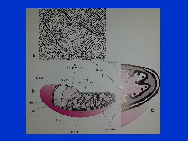 Mitokondride bulunan dış zarda porinler bulunurken iç zarda permeazlar, sitokromlar ve ATP sentetazlar bulunur. ATP sentetaz kuyruk kısmı ile iç zara gömülü olup granül kısmı toplu iğne başı gibi pozisyon almıştır. Bu duruma F 0 F 1 kompleksi denir. ATP sentezinden sorumludur. Mitokondriyonların iç kompartmanı aerobik solunumun gerçekleştiği yerdir. Hücrenin enerji merkezi olan mitokondriyonlarda hücre metabolizması için gerekli enerjinin %95’i sağlanır.