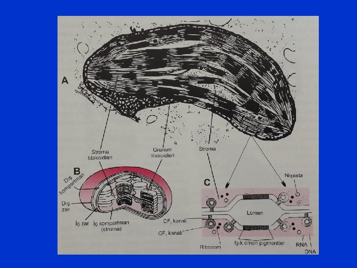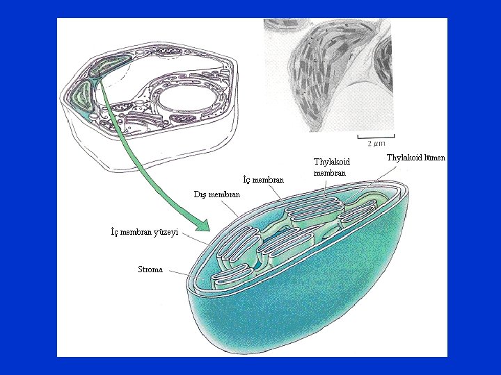 İç zar stromaya doğru üste dizili simit şeklinde tilakoid denen kesecikler oluşturur. Bu kesecikler granalardır. Stromada tek kalmış tilakoidler ise stroma tilakoidleridir. Bunlar granalar arsında ilişkiyi kurarlar. Tilakoid zarları üzerinde CF 0 CF 1 kompleksi denen granüller vardır. Bu kompleks 9 polipeptitden meydana gelmiştir. Polipeptitlerin 5 tanesi (CF 1 kompleksi) stromada ampul başı gibi olup yuvarlaktır. Diğer 4 tanesi (CF 0 kompleksi) ise tilakoid zarı içerisine gömülüdür ve tilakoid lümenine kanal oluşturur. Bu komplekse ATP sentetaz denir, ATP bu kompleksde oluşur.