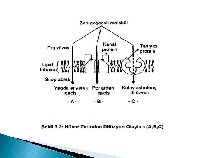 Hücre Zarında Difüzyon Lipoprotein yapıda olan hücre zarının çift katlı lipid kısmı intra ve ekstraselüler sıvılardaki maddelerin çoğunun geçişini engeller. Fakat yağda eriyen bu maddeler bu tabakayı kolayca geçebilir. Protein molekülleri ise daha farklı yapıya sahiptir. Bunlar ya kanal proteinleri olarak zarda oluşturduğu kanal veya porlardan su veya suda eriyen maddelerin kolayca hücre içine giriş çıkışını sağlarlar, ya da taşınacak maddeye bağlanıp taşıyıcı proteinler olarak maddenin zarı kat etmesini sağlarlar. O halde maddelerin hücre zarına geçişi ya lipidde ya da porlardan (protein kanal) olmaktadır.