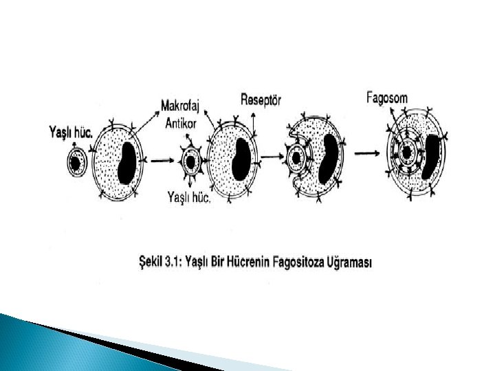 Fagosite edilecek partikül veya bakterilere karşı, organizma birtakım antikorlar üretir. Bu antikorlar fagosite edilecek yapıların yüzeyini kaplar. Böylece makrofaj özel reseptörleri sayesinde onları tanıyarak kendine bağlar. Aktive edilen reseptörden hücre içine iletilen sinyal, fagositozu başlatır ve hücre zarı uzayarak partikülün etrafını sarar ve onu içine alır. Hücre içine alınan fagositik vezikül (fagozom), 40 dan fazla enzim ihtiva eden primer lizozomlarla birleşerek heterolizozomları (sekonder lizozom) oluştururlar. Heterolizozomlardaki enzimler yardımıyla alınan bu yabancı maddeler tamamen sindirilir.