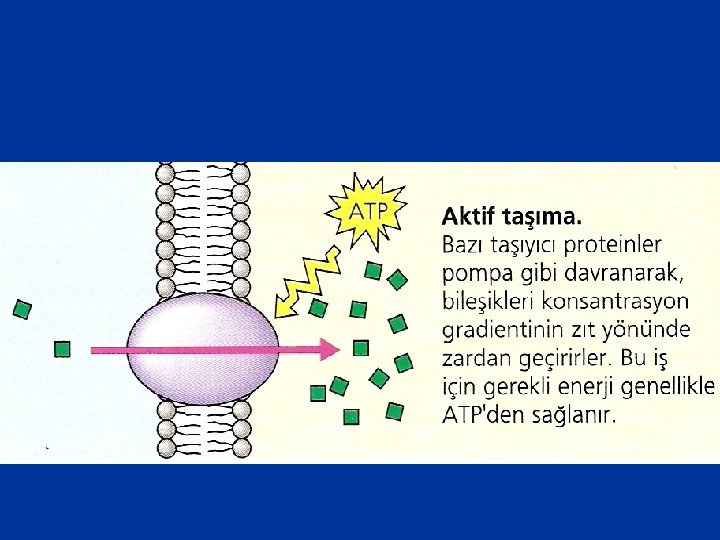 3 -Aktif Taşınma Bazı taşıyıcı proteinler çözüneni konsantrasyon gradientinin tersi yönünde hareket ettirebilirler. Yani çözünen madde az olduğu taraftan çok olduğu tarafa doğru taşınırlar. Bu molekülleri konsantrasyon gradientinin zıt yönünde zardan pompalamak için hücrenin kendi metabolik enerjisini harcaması gerekir. Bu tip zar trafiğine aktif taşıma adı verilir. Hücre bazen gerekenden fazla maddeyi enerji harcayarak dışarı atar veya gerekli maddeleri enerji harcayarak hücre içerisine alır. Şekerler, amino asitler hücreye bu yolla girerler. Ancak vitaminler, büyüme hormonları, insülin, androjenler amino asitlerin taşınmasını hızlandırırlar.