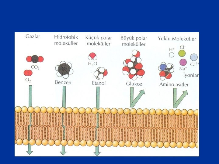 Ø Hücre zarından Örn. Şekerler, amino asitler hücre içerisine girerken, metabolizma sonucu oluşan artık ürünler hücre dışına çıkarlar. Ø Hücre zarında kural olarak ör. O 2, CO 2, N gibi küçük apolar moleküller, kısmen polar fakat su, gliserol, üre, etanol gibi nötr moleküller hücre zarından kolayca geçerler. Ø Glukoz, Sukroz gibi büyük moleküller ve Na+, K+, Ca+2 ve Cl- iyonları zardan geçemez. Bunlar, özelleşmiş taşıyıcı proteinlere veya iyon kanalları vasıtası ile geçerler. Ø Çok daha büyük moleküller ise pinositoz veya fagositoz aracılığı ile hücre içerisine alınırlar.