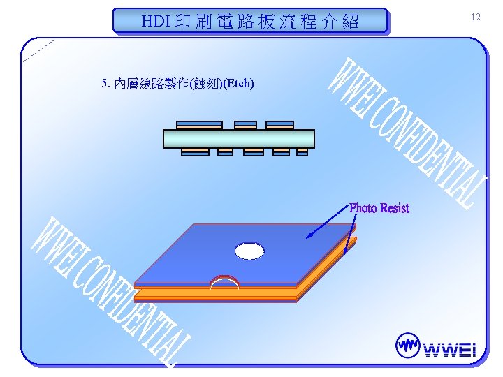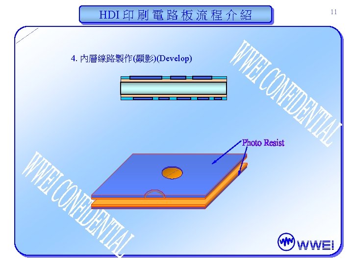 HDI 印 刷 電 路 板 流 程 介 紹 10 3. 內層線路製作(曝光)(Expose) A/W Photo Resist Artwork (底片) Before Expose After Expose