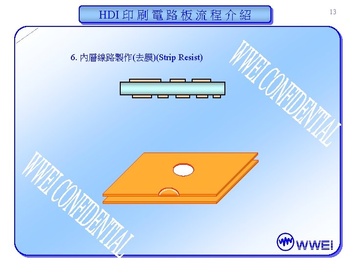 HDI 印 刷 電 路 板 流 程 介 紹 Pattern imaging Solder Mask Gold plating Routing Electrical test 5