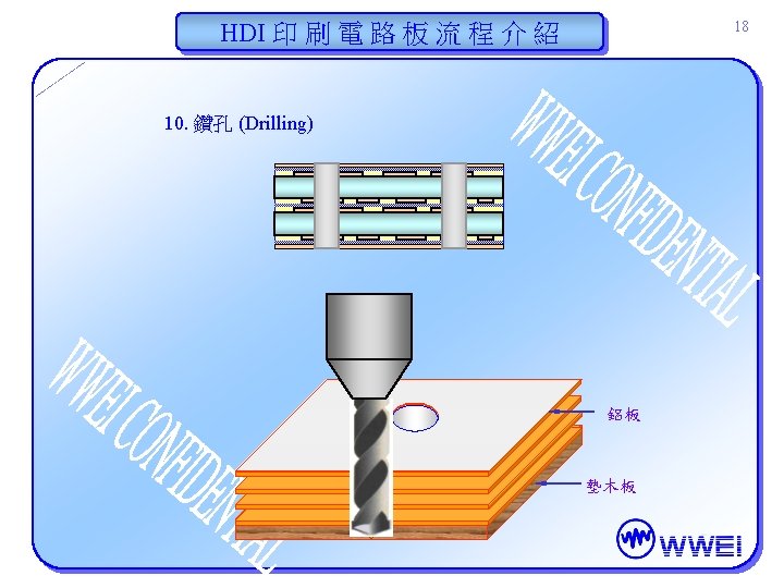 HDI 印 刷 電 路 板 流 程 介 紹 17 典型之多層板疊板及壓合結構 壓合機之熱板 COMP S 0 LD. . 疊合用之鋼板 COPPER FOIL 0. 5 OZ prepreg Thin Core , FR-4 prepreg COPPER FOIL 0. 5 OZ 疊合用之鋼板 . . COMP S 0 LD. 10 -12層疊合 疊合用之鋼板 COPPER FOIL 0. 5 OZ prepreg Thin Core , FR-4 prepreg COPPER FOIL 0. 5 OZ 疊合用之鋼板 壓合機之熱板
