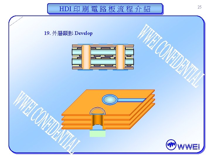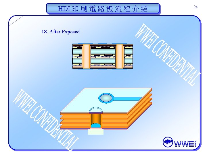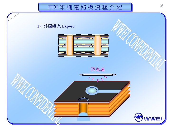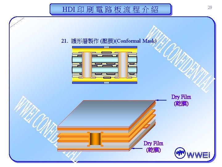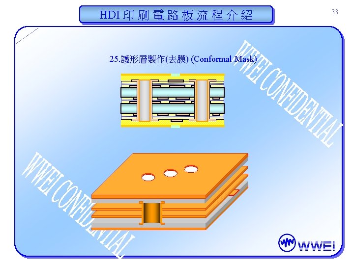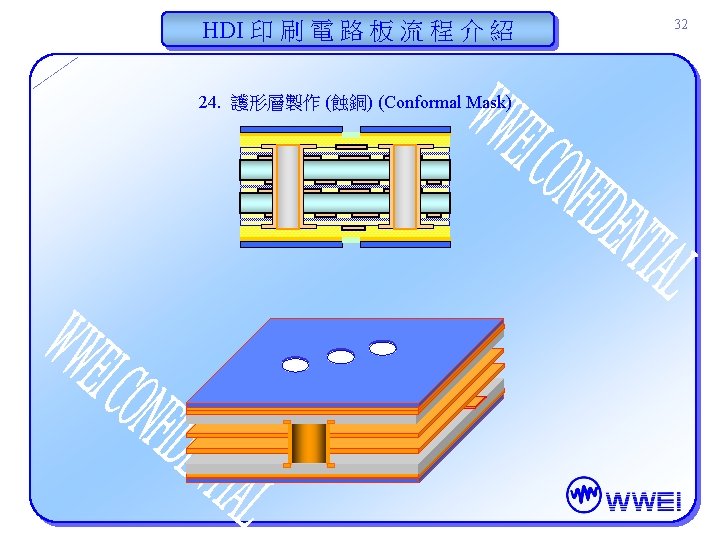 HDI 印 刷 電 路 板 流 程 介 紹 30 22. 護形層製作 (曝光)(Conformal Mask) Artwork (底片) Before Exposure Artwork (底片) After Exposure