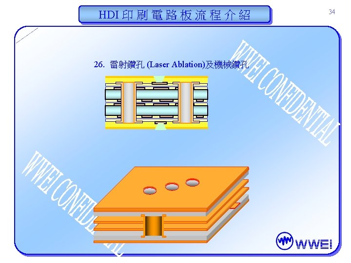HDI 印 刷 電 路 板 流 程 介 紹 Pattern imaging Lamination Laser Ablation Mechanical drilling Cu plating 4