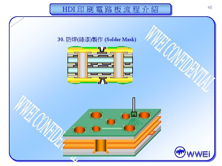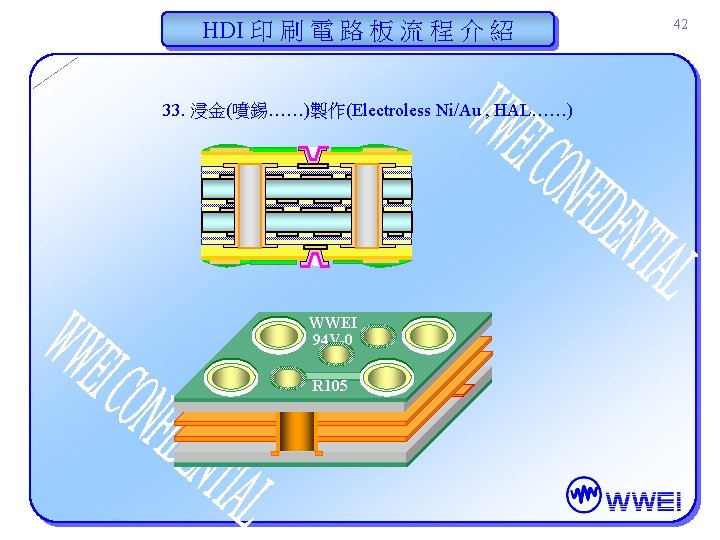HDI 印 刷 電 路 板 流 程 介 紹 31. S/M 顯像 (S/M Developing) 32. 印文字 (Legend Printing) WWEI 94 V-0 R 105 41