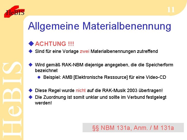 He. BIS 11 Allgemeine Materialbenennung u ACHTUNG !!! u Sind für eine Vorlage zwei Materialbenennungen zutreffend u Wird gemäß RAK-NBM diejenige angegeben, die Speicherform bezeichnet n Beispiel: AMB [Elektronische Ressource] für eine Video-CD u Diese Regel wurde nicht auf die RAK-Musik 2003 übertragen! u Die Zuordnung ist somit unklar und sollte im Verbund festgelegt werden! §§ NBM 131 a, Anm. / M 131 a