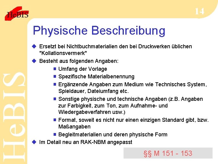 14 Physische Beschreibung He. BIS u Ersetzt bei Nichtbuchmaterialien den bei Druckwerken üblichen "Kollationsvermerk" u Besteht aus folgenden Angaben: g Umfang der Vorlage g Spezifische Materialbenennung g Ergänzende Angaben zum Medium wie Technisches System, Spieldauer, Dateiumfang etc. g Sonstige physische und technische Angaben (z. B. Angaben zur Farbigkeit, zum Ton, zum Aufnahme- und Wiedergabeverfahren usw. ) g Format, soweit es nicht nur einen einzigen Standard gibt, bzw. Maßangaben g Begleitmaterialien und deren physische Form u Im Detail neu an RAK-NBM angepasst §§ M 151 - 153