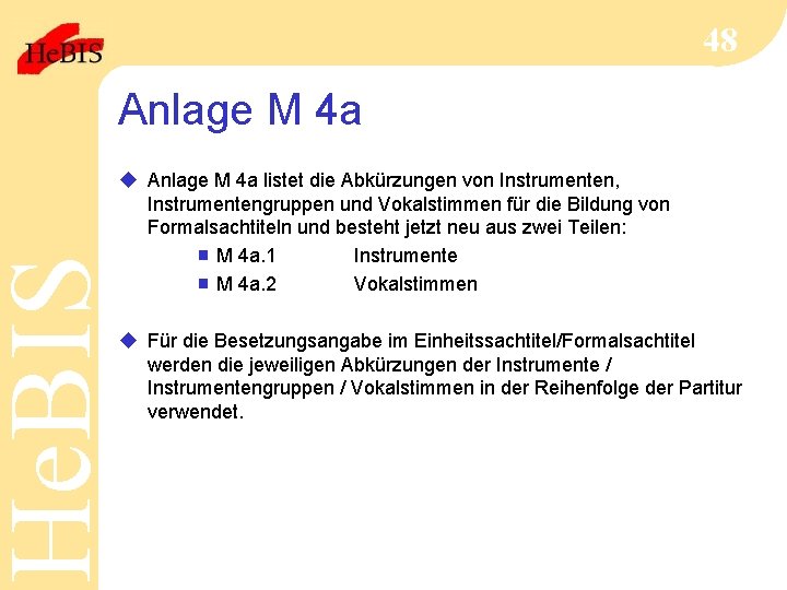 He. BIS 48 Anlage M 4 a u Anlage M 4 a listet die Abkürzungen von Instrumenten, Instrumentengruppen und Vokalstimmen für die Bildung von Formalsachtiteln und besteht jetzt neu aus zwei Teilen: g M 4 a. 1 Instrumente g M 4 a. 2 Vokalstimmen u Für die Besetzungsangabe im Einheitssachtitel/Formalsachtitel werden die jeweiligen Abkürzungen der Instrumente / Instrumentengruppen / Vokalstimmen in der Reihenfolge der Partitur verwendet.