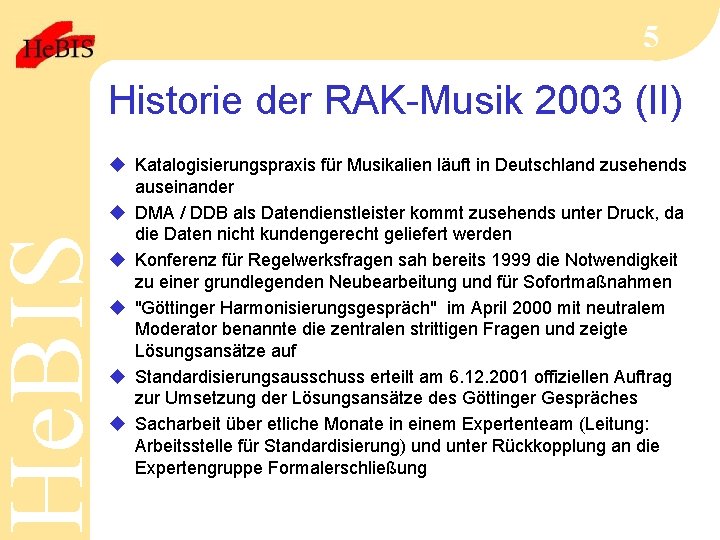 He. BIS 5 Historie der RAK-Musik 2003 (II) u Katalogisierungspraxis für Musikalien läuft in Deutschland zusehends auseinander u DMA / DDB als Datendienstleister kommt zusehends unter Druck, da die Daten nicht kundengerecht geliefert werden u Konferenz für Regelwerksfragen sah bereits 1999 die Notwendigkeit zu einer grundlegenden Neubearbeitung und für Sofortmaßnahmen u "Göttinger Harmonisierungsgespräch" im April 2000 mit neutralem Moderator benannte die zentralen strittigen Fragen und zeigte Lösungsansätze auf u Standardisierungsausschuss erteilt am 6. 12. 2001 offiziellen Auftrag zur Umsetzung der Lösungsansätze des Göttinger Gespräches u Sacharbeit über etliche Monate in einem Expertenteam (Leitung: Arbeitsstelle für Standardisierung) und unter Rückkopplung an die Expertengruppe Formalerschließung