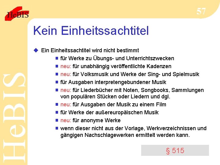 He. BIS 57 Kein Einheitssachtitel u Einheitssachtitel wird nicht bestimmt g für Werke zu Übungs- und Unterrichtszwecken g neu: für unabhängig veröffentlichte Kadenzen g neu: für Volksmusik und Werke der Sing- und Spielmusik g für Ausgaben interpretengebundener Musik g neu: für Liederbücher mit Noten, Songbooks, Sammlungen von populären Stücken oder Liedern und dgl. g neu: für Ausgaben der Musik zu einem Film g für Werke der außereuropäischen Musik g neu: für anonyme Werke g wenn dieser nicht aus der Vorlage, Werkverzeichnissen und gängigen Nachschlagewerken ermittelt werden kann. § 515