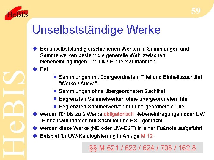 He. BIS 59 Unselbstständige Werke u Bei unselbstständig erschienenen Werken in Sammlungen und Sammelwerken besteht die generelle Wahl zwischen Nebeneintragungen und UW-Einheitsaufnahmen. u Bei g Sammlungen mit übergeordnetem Titel und Einheitssachtitel "Werke / Ausw. ": g Sammlungen ohne übergeordneten Sachtitel g Begrenzten Sammelwerken ohne übergeordneten Titel g Begrenzten Sammelwerken mit übergeordnetem Titel u werden für bis zu 3 Werke obligatorisch Nebeneintragungen oder UW -Einheitsaufnahmen mit Sachtitel und EST gemacht u werden diese Werke (NE oder UW-EST) in einer Fußnote aufgeführt u Beispiel für UW-Katalogisierung in Anlage M 12 §§ M 621 / 623 / 624 / 708 / 162, 8