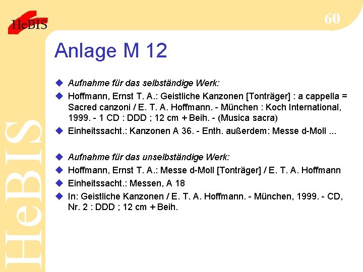 He. BIS 60 Anlage M 12 u Aufnahme für das selbständige Werk: u Hoffmann, Ernst T. A. : Geistliche Kanzonen [Tonträger] : a cappella = Sacred canzoni / E. T. A. Hoffmann. - München : Koch International, 1999. - 1 CD : DDD ; 12 cm + Beih. - (Musica sacra) u Einheitssacht. : Kanzonen A 36. - Enth. außerdem: Messe d-Moll. . . u u Aufnahme für das unselbständige Werk: Hoffmann, Ernst T. A. : Messe d-Moll [Tonträger] / E. T. A. Hoffmann Einheitssacht. : Messen, A 18 In: Geistliche Kanzonen / E. T. A. Hoffmann. - München, 1999. - CD, Nr. 2 : DDD ; 12 cm + Beih.
