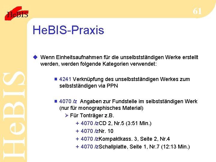 He. BIS 61 He. BIS-Praxis u Wenn Einheitsaufnahmen für die unselbstständigen Werke erstellt werden, werden folgende Kategorien verwendet: g 4241 Verknüpfung des unselbstständigen Werkes zum selbstständigen via PPN g 4070 /z Angaben zur Fundstelle im selbstständigen Werk (nur für monographisches Material) Ø Für Tonträger z. B. + 4070 /z. CD 2, Nr. 5 (3: 51 Min. ) + 4070 /z. Nr. 10 + 4070 /z. Kompaktkass. 3, Seite 2, Nr. 4 + 4070 /z. Schallplatte, Seite 1, Nr. 7 (12: 13 Min. )
