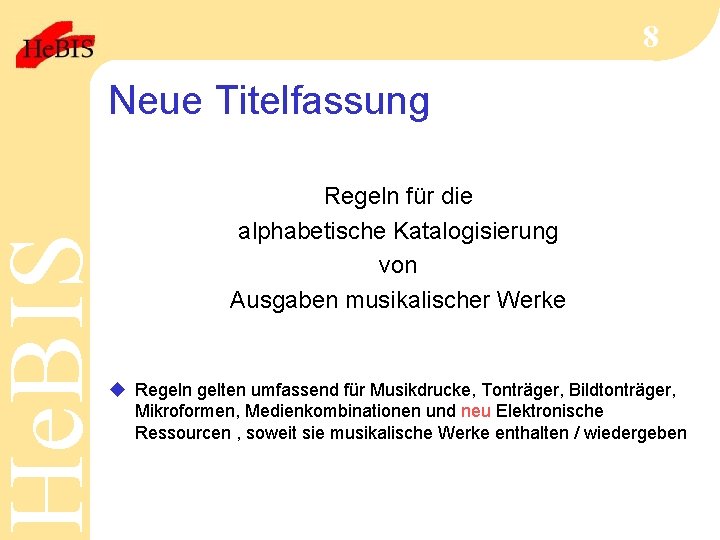 He. BIS 8 Neue Titelfassung Regeln für die alphabetische Katalogisierung von Ausgaben musikalischer Werke u Regeln gelten umfassend für Musikdrucke, Tonträger, Bildtonträger, Mikroformen, Medienkombinationen und neu Elektronische Ressourcen , soweit sie musikalische Werke enthalten / wiedergeben