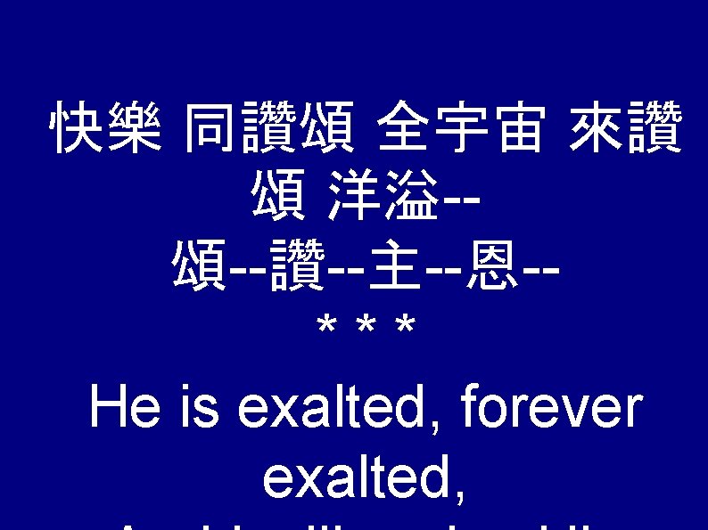 He Is Exalted He is exalted the King Slides: 19 Download presentation He Is Exalted 快樂 同讚頌 全宇宙 來讚 頌無盡 -- 榮耀救—主 *** He is exalted, the King is exalted on high, I will praise Him; 尊貴救主, 全地順服�真理 *** He is the Lord, Forever His truth shall reign; 宇宙四方, 同熱烈地讚美歌唱 *** Heaven and earth, Rejoice in His holy name. 快樂 同讚頌 齊慶賀 神 永在為王 *** He is exalted, The King is exalted on high. Es exaltado, En lo alto exaltado es el Rey, Le alabaré; *** He is exalted, the King is exalted on high, Es exaltado, por siempre exaltado, Y yo le alabaré. *** He is exalted, forever exalted, Él es Señor, Por siempre reinará; *** He is the Lord, Forever His truth shall Su creación, En Él se gozará; *** Heaven and earth, Rejoice in His holy name. Es exaltado, En lo alto exaltado es el Rey. *** He is exalted, The King is exalted on Él es Señor, *** 尊貴救主, *** He is the Lord, Por siempre reinará; *** 全地順服�真理 *** Forever His truth shall reign; Su creación, *** 宇宙四方, *** Heaven and earth, En Él se gozará; *** 同熱烈地讚美歌唱 *** Rejoice in His holy name. Es exaltado, En lo alto exaltado es el Rey. *** 快樂 同讚頌 齊慶賀 神 永在為王 *** Es exaltado, En lo alto exaltado es el Rey. *** 快樂 同讚頌 齊慶賀 神 永在為王 *** Es exaltado, En lo alto exaltado es el Rey. *** 快樂 同讚頌 齊慶賀 神 永在為王 ***
