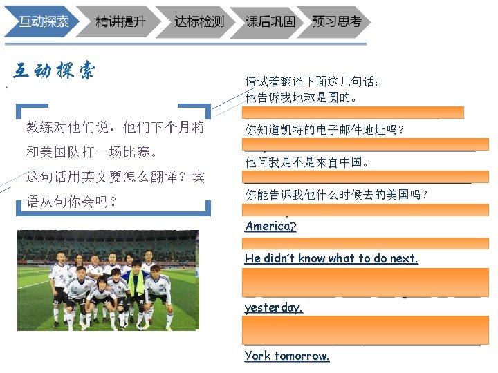 宾语从句的时态 主句是现在时态时, 从句时态不受主句影响。 主句是过去时态时,从句 必须用相应的过去时态。 当从句描述的是客观 事实、真理等时,从 句都要用一般现在时。 He says (that)he will study English tomorrow. He says (that)he studies English every day. He says (that)he studied English five days ago. He said (that)he studied English every day. He said (that)he would study English tomorrow. He said (that)he had studied English for five years. He says(said)that the earth goes around the sun. He says(said)that it is better to give than to receive.