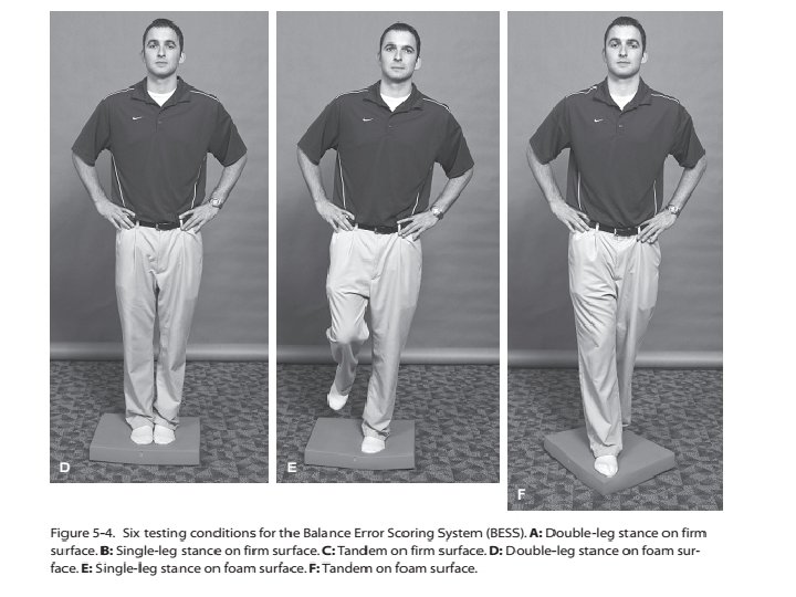 Research has found the BESS to be a reliable and valid assessment tool for the management of sport related concussion. Three different stances (double, single, and tandem) are completed twice, once while on a firm surface and once while on a 10 -cm–thick piece of medium density foam (Airex) for a total of six trials.
