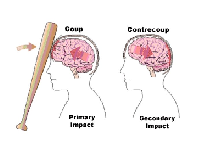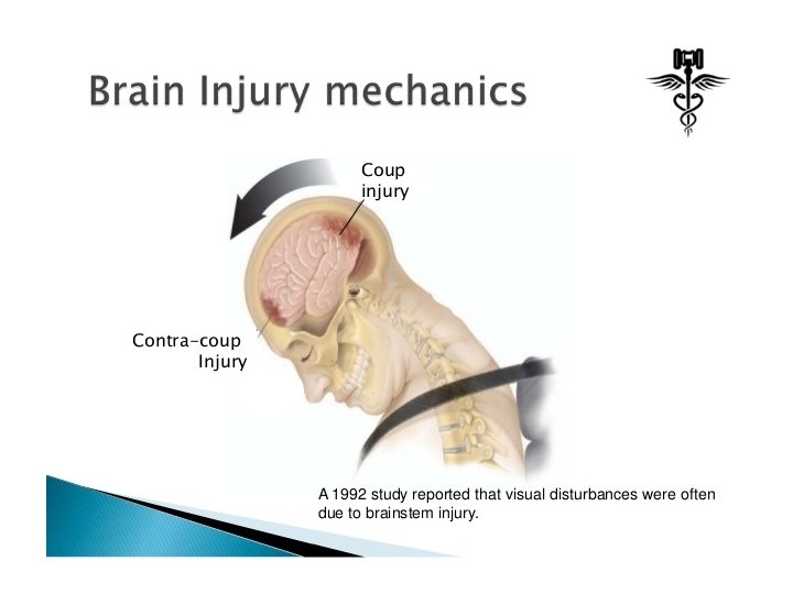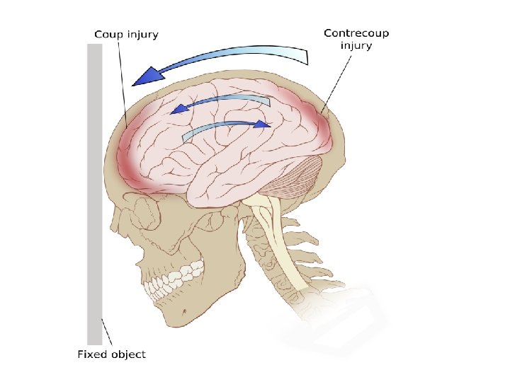 (Contre coup injury) • A moving head hitting against an unyielding object usually produces maximum brain injury opposite the site of cranial impact as the brain rebounds within the cranium.