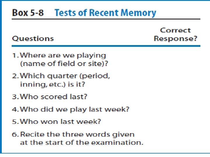 Amnesia testing The clinician can perform amnesia testing by first asking the athlete simple questions directed toward recent memory and progressing to more involved questions. Asking the athlete for the first thing he or she remembered after the injury will test for length of posttraumatic amnesia, also known as anterograde amnesia. Asking what the play was before the injury or who the opponent was last week will test for retrograde amnesia. Retrograde amnesia is generally associated with a more serious head injury.