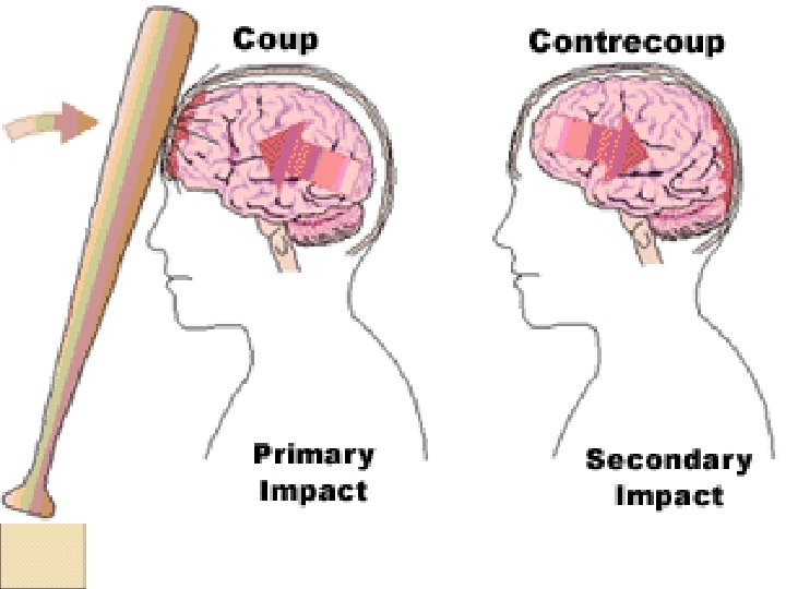 Direct Brain Injury Types Coup ◦ Injury at site of impact Contrecoup ◦ Injury on opposite side from impact A coup injury occurs under the site of impact with an object, and a contrecoup injury occurs on the side opposite the area that was impacted.