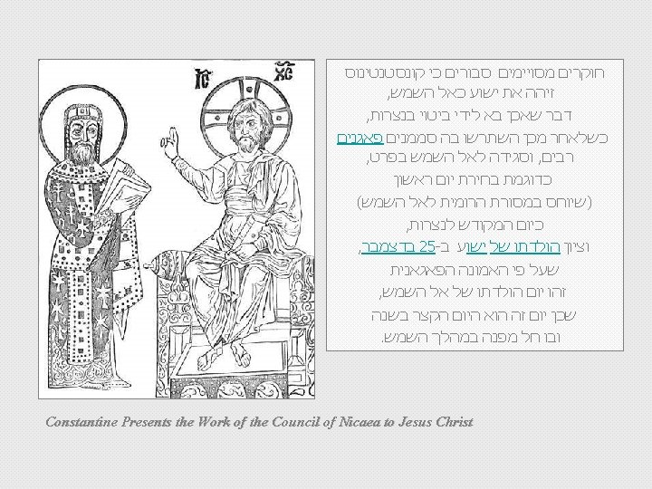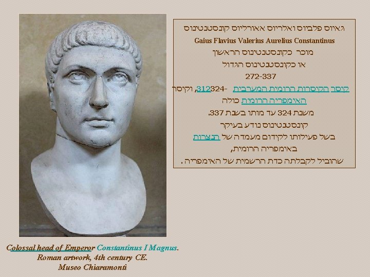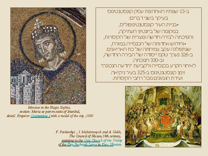 : מקורות http: //he. wikipedia. org/Constantinus http: //commons. wikimedia/Constantine_I http: //www. artcyclopedia/Constantine http: //www. wga. hu/Constantine לקסיקון לנצרות , איתן בורשטיין קונסטנטינוס הגדול , אנציקלופדיה עברית : המוסיקה GOUNOD: St. Cecillia Mass: Credo Czech Philharmonic Orchestra & Chorus, Prague IGOR MARKEVITCH Icon of St. Constantine אסף פלר : עריכה