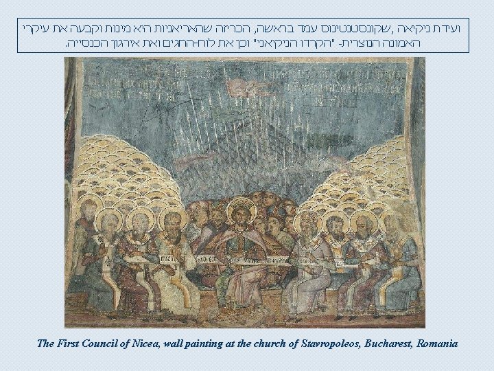 Icon depicting the First Council of Nicaea. Icon from the Mégalo Metéoron Monastery in Greece, representing the First Ecumenical Council of Nikea 325 A. D. , with the condemned Arius in the bottom of the icon.