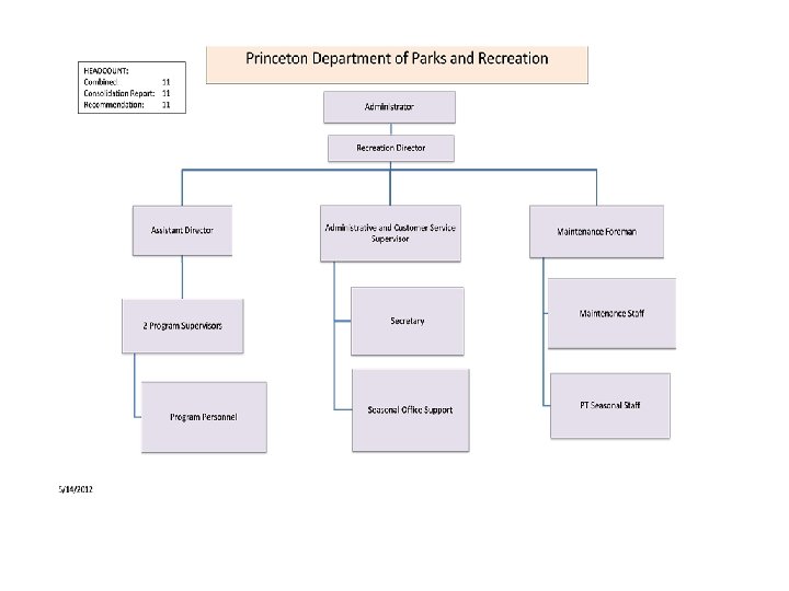 Headcount: Current Positions Borough Current Positions Count Township Recommended Positions Count Consolidation Report Recommended Positions Personnel Subcommittee Consolidation Recommendation Savings Count Personnel Subcommittee Count Report Savings Director 1 Assistant Director 1 Program Supervisors 2 Administrative Supervisor 1 Secretary 1 Foreman 1 Assistant Forman 1 Maintenance Staff 3 * It is noted that the Consolidation Commission Report recommended the maintenance staff be relocated under Public Works with no reduction in force. 0 11 11. 00 $0. 00