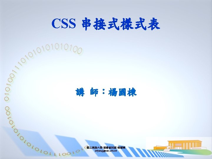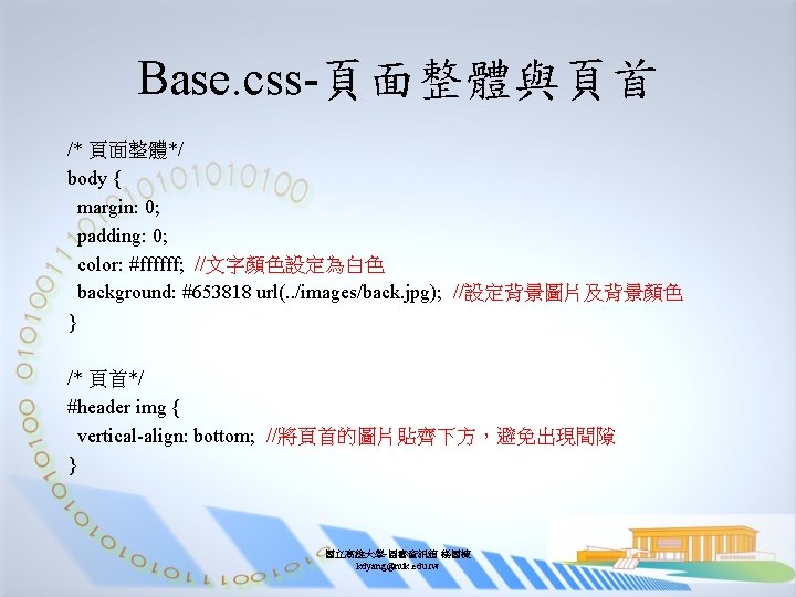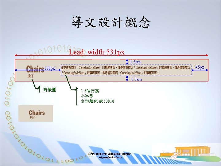 Base. css-標題與導文 h 1 { //文字採絕對位置隱藏於網頁左側 position: absolute; left: -999 px; width: 990 px; } #lead { margin: 0; padding: 1. 5 em 45 px 1. 5 em 180 px; //向右移 180 px空出空間讓背景圖可以呈現 border-top: 3 px solid #b 8 a 68 a; width: 531 px; line-height: 1. 5; font-size: x-small; color: #653818; background: #e 0 d 8 cb url(. . /images/heading 1. gif) left no-repeat; } 國立高雄大學-圖書資訊館 楊國棟 kdyang@nuk. edu. tw