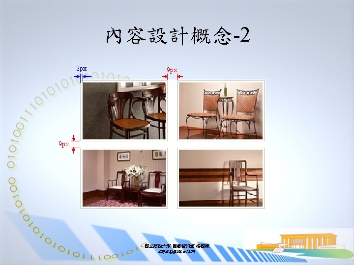 內容設計概念-1 Content width: 675 px 32 px 行高: 95 px 36 px 45 px 23 px 國立高雄大學-圖書資訊館 楊國棟 kdyang@nuk. edu. tw