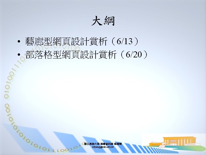 Base. css-內容 #content { padding: 32 px 36 px 23 px 45 px; width: 675 px; line-height: 95 px; color: #653818; background: #ffffff; } #content img { margin-right: 9 px; margin-bottom: 9 px; padding: 2 px; border: 1 px solid #e 0 d 8 cb; vertical-align: bottom; } 國立高雄大學-圖書資訊館 楊國棟 kdyang@nuk. edu. tw