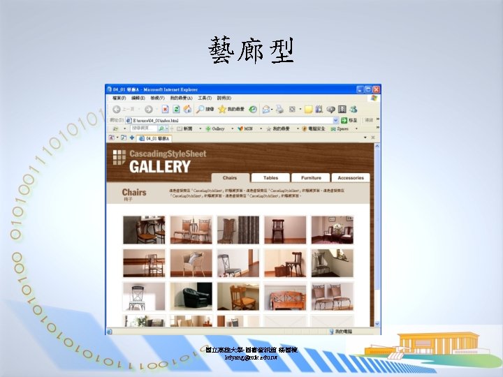 原始碼部分 <body> <div id="header"> <a href="/" title="回首頁"><img src="images/logo. jpg" width="301" height="111" alt=“…" /></a> </div> <ul id="navigation"> <li id="chairs">椅子</li> <li id="tables"><a href="tables. html">桌子</a></li> <li id="furniture"><a href="furniture. html">家具</a></li> <li id="accessories"><a href="accessories. html">飾品</a></li> </ul> <h 1>椅子</h 1> <p id="lead"> 這是虛擬商店「Cascading. Style. Sheet」的藝廊頁面。. . . </p> <div id="content"> <a href="c 01. html"><img src="images/chairs/c 01. jpg" width="120" height="80" alt="椅子 01" /></a>. . . <a href="c 18. html"><img src="images/chairs/c 18. jpg" width="120" height="80" alt="椅子 18" /></a> <img src="images/chairs/c 99. jpg" width="120" height="80" alt="" /> </div> <p id="footer"> <span>All rights reserved</span> Cascading. Style. Sheet & Co. 2004 -2005 </p> </body> 國立高雄大學-圖書資訊館 楊國棟 kdyang@nuk. edu. tw