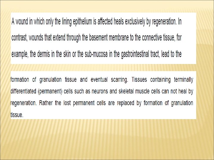 Healing is the ability to repair the damage caused by injurious agents & inflammation. Its occurs by Regeneration of injured tissue and Repair by connective tissue (healing by scaring). Usually tissue repairinvolves both processesand associated with acute inflammatory diseases. The healing process involves two distinct processes: 1 -Regeneration: complete reinstitution of the damaged components of the affected tissueby tissues similar in type, the tissueessentially returns to a normal state(ex. Superficial wounds , Remove half of the liver: it will grow back) 2 -Repair (healing by scaring): the replacement of lost tissue bygranulation tissue whichmatures to form scar tissue. Itsa process characterized by laying down of new connective (fibrous) tissue that results inscarformation(ex. Deep wounds healingin the skin), This mode occurs when: 1. The injured tissues are incapable of complete regeneration, or 2. The supporting structures of the tissue are severely damagedresulting fibrous scar and make granulation tissue.