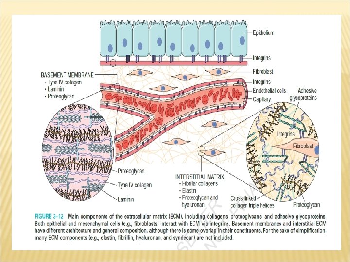 EXTRACELLULAR MATRIX (ECM) AND CELL-MATRIX INTERACTIONS Tissue repair depends not only on growth factor activity but also on interactions between cells and ECMcomponents. The ECM is composed of three groups of macromolecules: 1 -fibrous structural proteins, such as collagens and elastins that provide tensile strength and recoil; 2 -adhesive glycoproteins that connect the matrix elements to one another and to cells; 3 - proteoglycans and hyaluronan that provide flexibility and. Lubrication Of ECM: 1 -Interstitial matrix, which is present in the spaces between mesenchymal (connective tissue) cells, andbetween epithelium and supportive vascular and smooth muscle structures; it is synthesized by themesenchymal cells (e. g. , fibroblasts). Its major constituents are fibrillar and nonfibrillar collagens, as well asfibronectin, elastin, proteoglycans, hyaluronate, and other elements. 2 -Basement membrane, which lies under the epithelium and is synthesized by overlying epithelium andunderlying mesenchymal cells; it tends to form a platelike. Its major constituents areamorphous nonfibrillar type IV collagen and laminin.