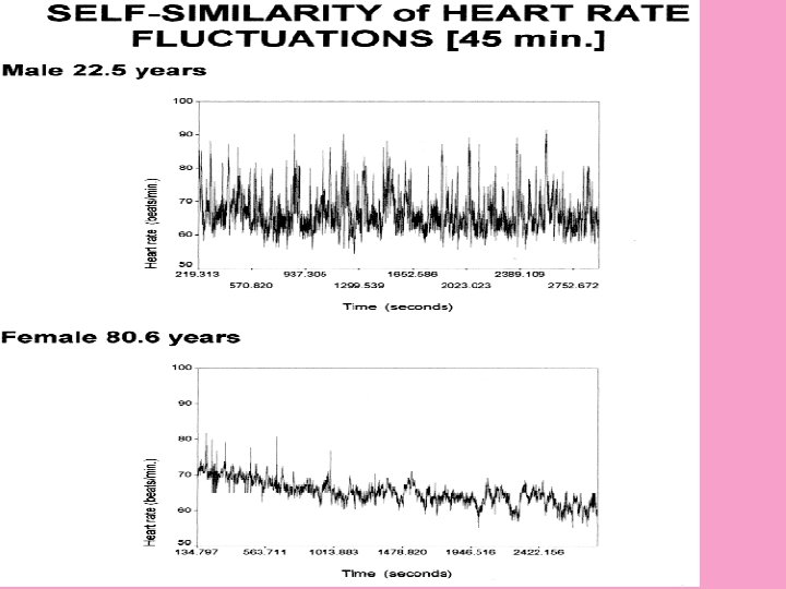 Self-organising behaviour can be measured quantitatively For example, Goldberger and Peng* have established that the rhythmic order of heart rate degrades to a more random condition in certain heart pathologies such as angina and congestive heart disease, and also with healthy ageing. This loss of order suggests that these complex rhythms are vital to health through maintaining the plasticity of our adaptive responses. * http: //reylab. bidmc. harvard. edu