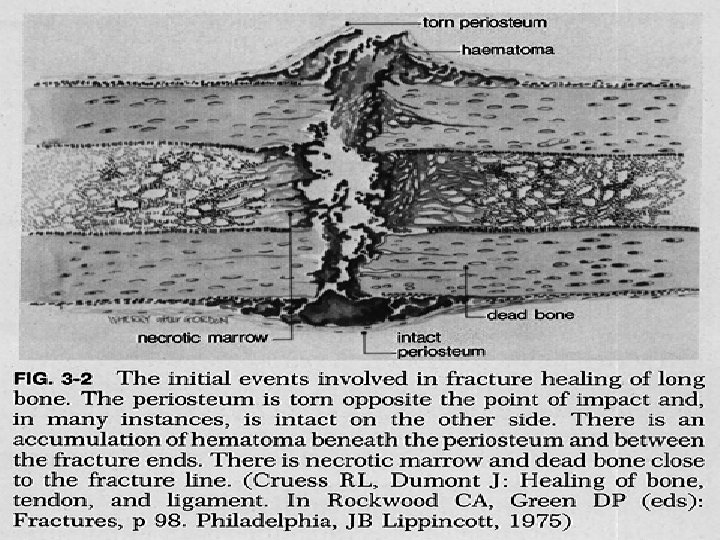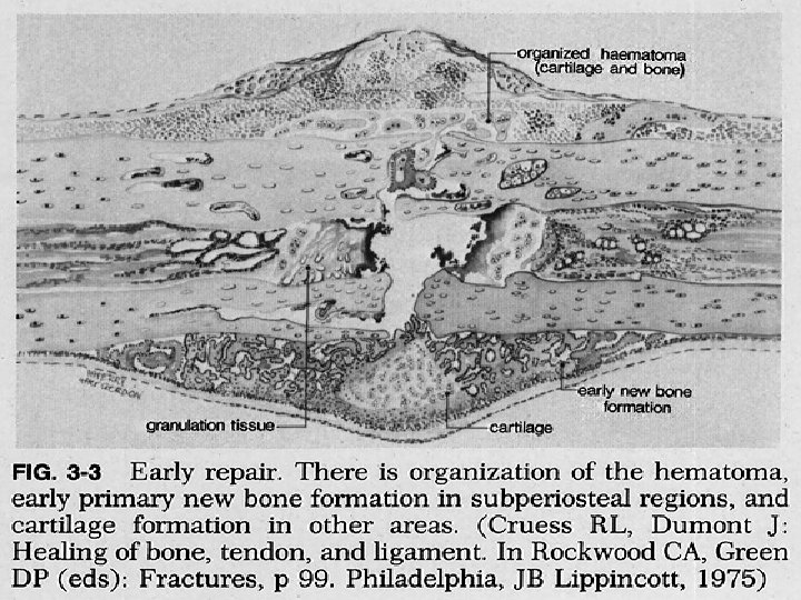 Healing of bone fractures: �I. Healing by primary union: rare e. g. in compression fractures. �II. Healing by formation of callus. Similar to healing by secondary union which includes: • Injury----> Fracture----> formation of blood clot • Inflammation start-----> removal of blood clot • Replacement by granulation tissue consisting of capillary and mesenchymal cells (Osteoblast). • Formation of collagen fibers and Osteomucin (Osteoid tissue). calcification-----> Woven bone. Removal of woven bone and replacement by lamellar bone.