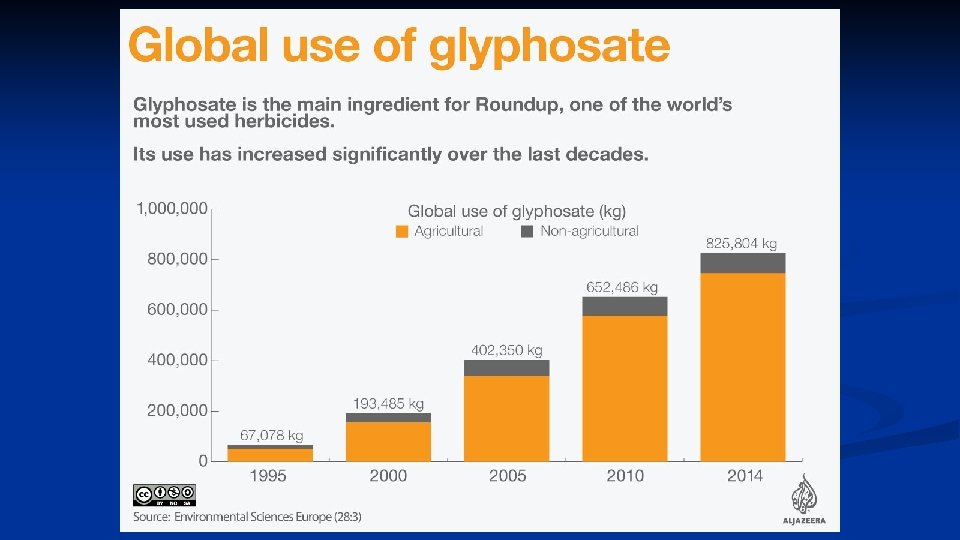 GE Crops and Herbicide/Insecticide Use n Overall herbicide use up over 15 -fold between 1996 and 2014 n 19 billion lbs of glyphosate sprayed between 1996 and 2016 n 20 -fold increase in glyphosate spraying in US between 1995 and 2014 (to 250 million lbs/yr) n ¾ lb/acre sprayed on cropland in US, ½ lb/acre worldwide (2014)