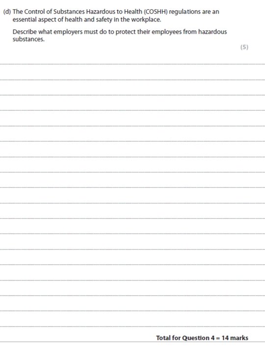 COSHH • COSHH is the law that requires employers to control substances that are hazardous to health. • • • What you need to do Identifying hazard and assessing risk Exposure limits Safety data sheets Control measures Personal protective equipment Monitoring Health surveillance Training Emergencies Give/State/Name (Red), Describe/Outline(Red and Amber), Explain/Justify (Amber) , Evaluate/Discuss/Compare (Green)