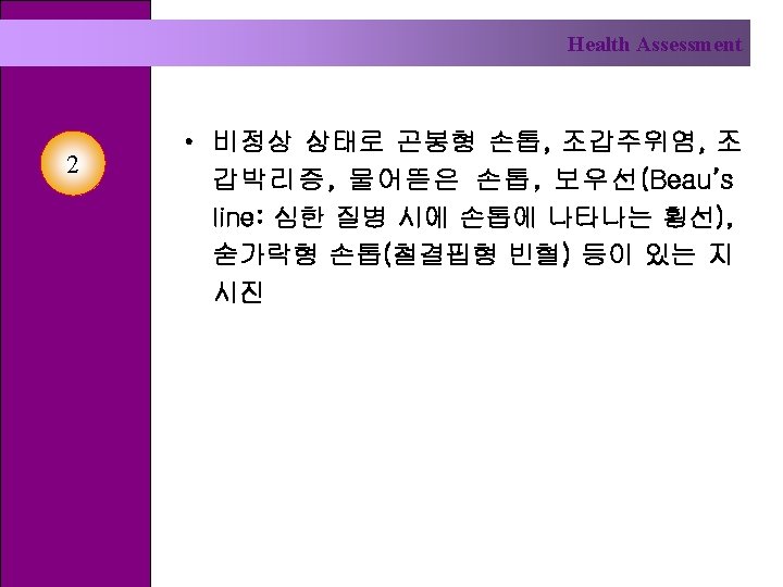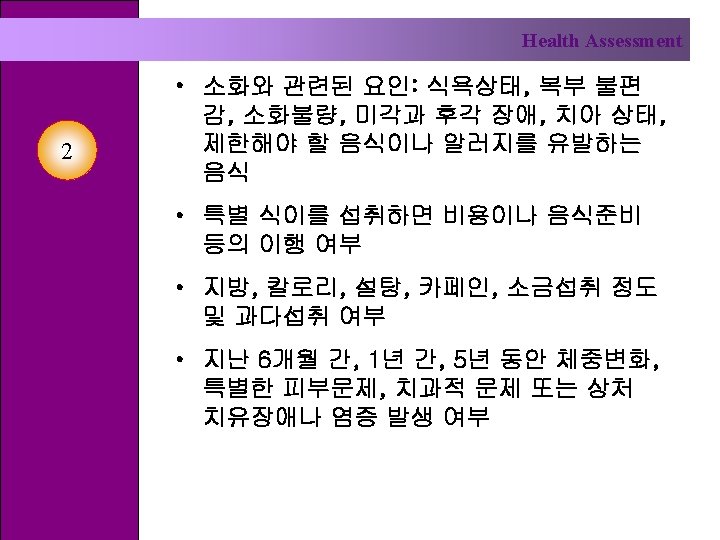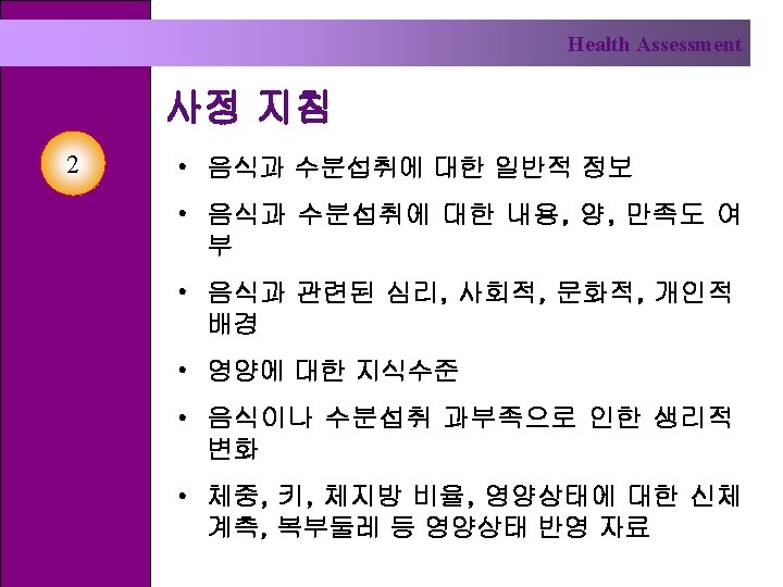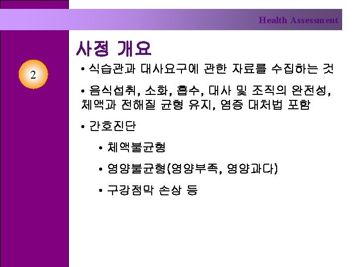 Health Assessment 2 Objectives 1. 영양-대사 양상의 사정 2. 배설 양상의 사정