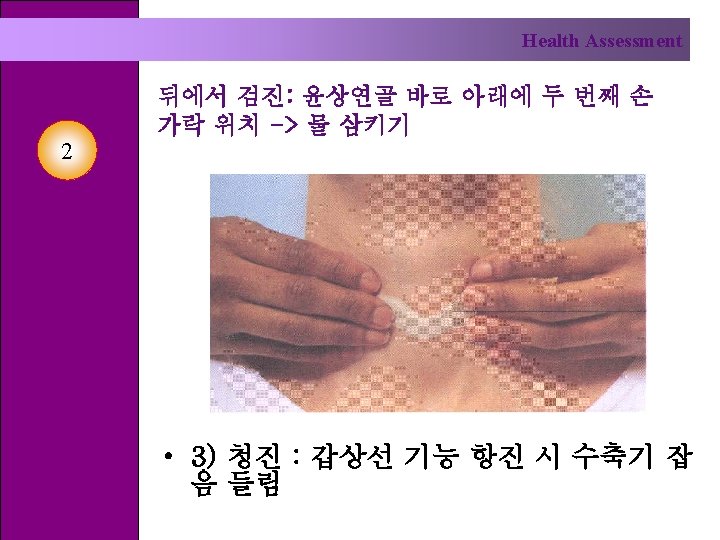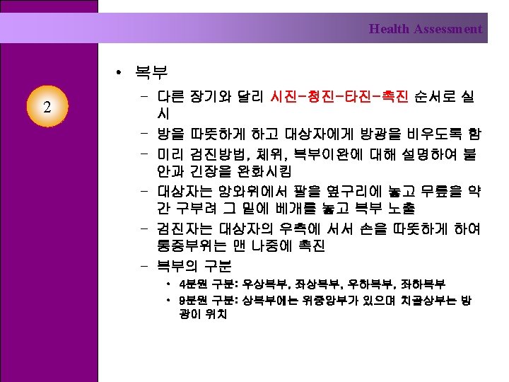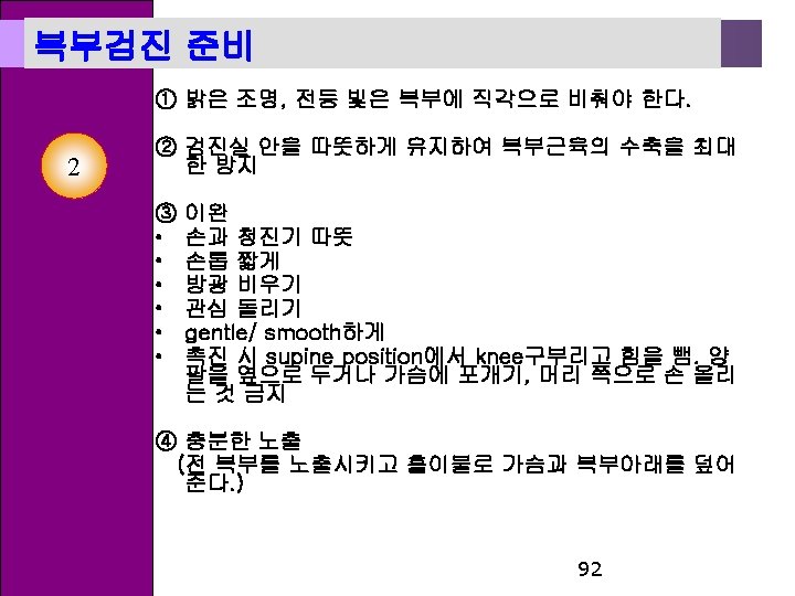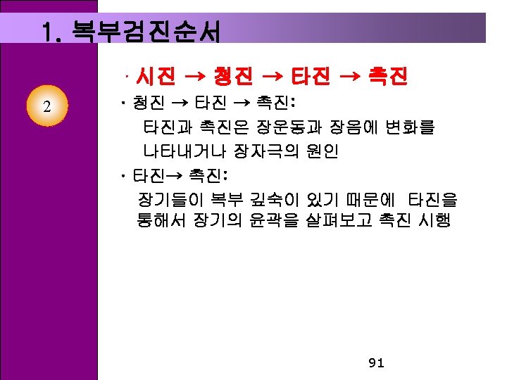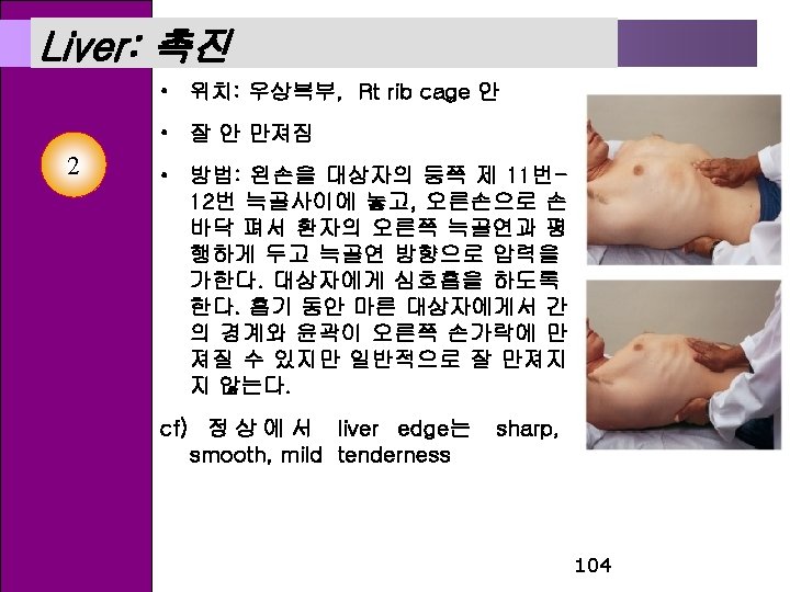 촉진 ① light palpation : 압통, 근저항(rigidity), 표면 mass check 2 – 이완상태인지 꼭 확인, 4분원을 따라 원방향으로 – parietal peritoneal inflammation시 irritation sign 유무 보기(염증 존재 시 tenderness detect 가능) ex) 복 막염 ② deep palpation : 타진을 통한 결과를 염두에 두고 촉진 – abdominal solid organ과 mass 존재여부 검사 → mass 의 firmness, shape, mobility, consistency 등 기술 ③ hooking technique : 비만증 대상자의 간 촉진 103