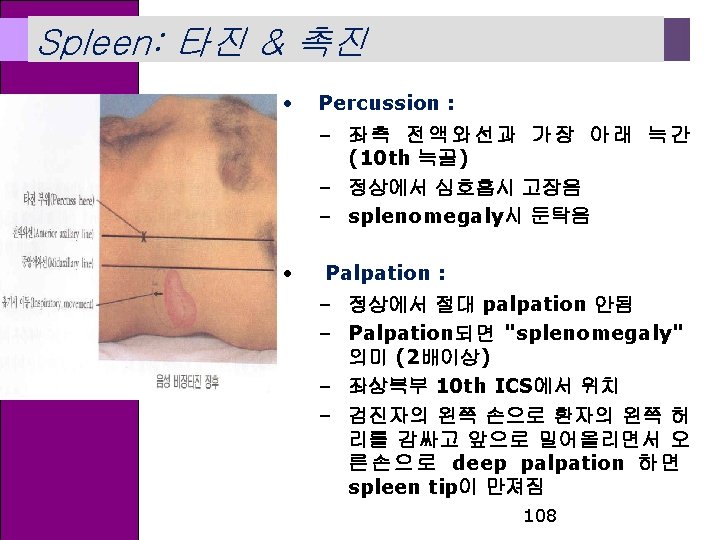 Spleen: 촉진 • “splenomegaly“ occurs with; 2 – Portal hypertension – Inflammation of the spleen – Hematologic diseases 109