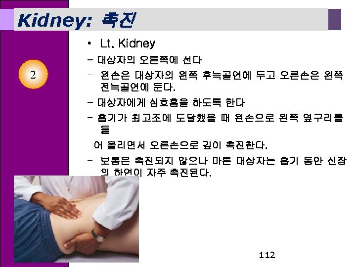 Gall Bladder • Percussion : 주먹타진으로 압통 확인 2 • Palpation : 정상적으로 GB palpation 안됨 – 담낭이 cystic duct obstruction에 의해 확장 된 경우 만져짐 – Murphy's sign: acute cholecystitis 때 deep inspiration 시키면서 RUQ palpation시 tenderness로 호흡을 멈춤 (inspiratory arrest) 110
