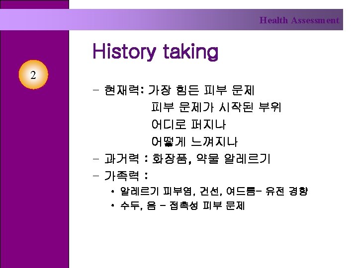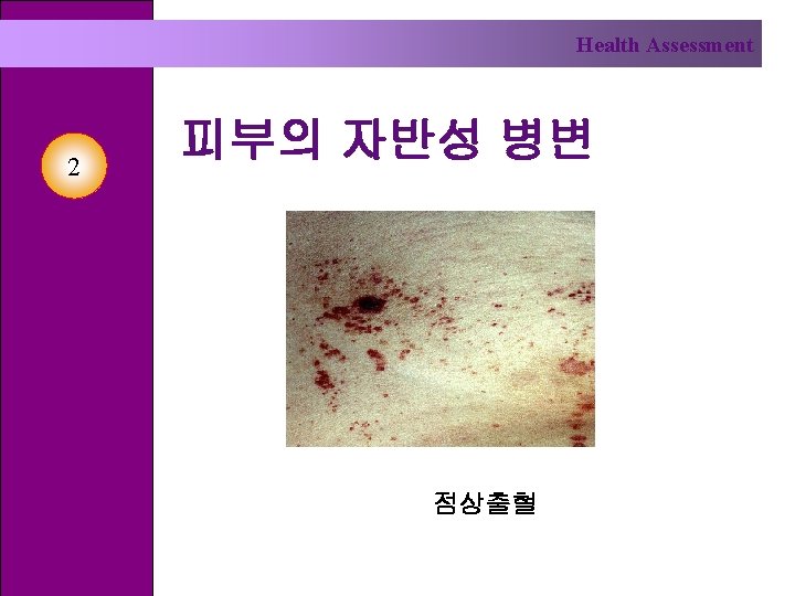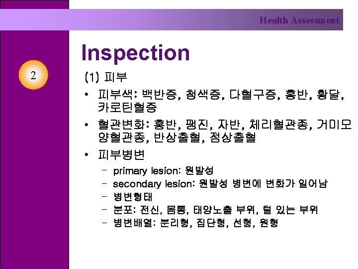 Health Assessment 2 1차 병변(Primary lesion) 구진 피진 판 소결절 반점