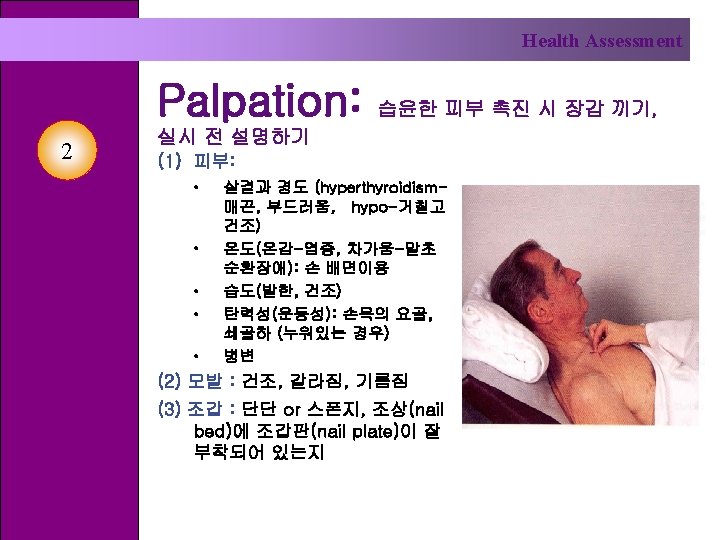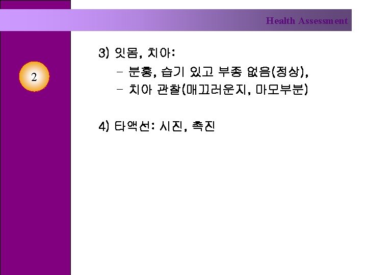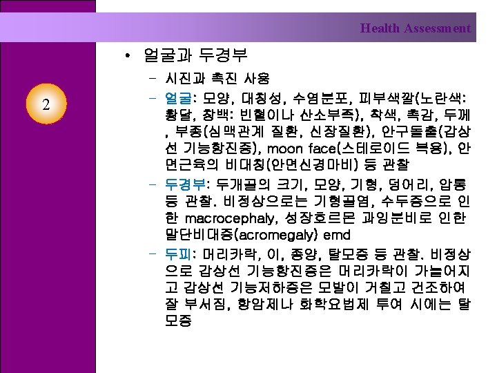 Health Assessment 2 Equipment needed • Strong direct lighting (자연광이 가장 이상적이나 임상현장에서는 사용힘듦) • Centimeter ruler • Penlight • Gloves