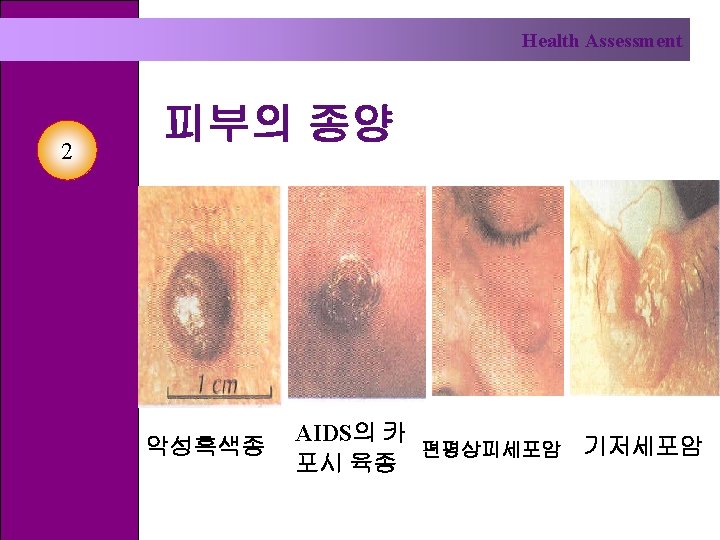 Health Assessment 2 매독의 구하감(chancre of Syphilis) 구개의 아구창(thrush of the Palate) 베젯씨 증후군(Peutz. Jeghers Syndrome) 에이즈의 카포시 육종 (Kaposl’s Sarcoma in AIDS)