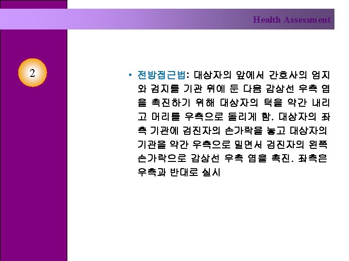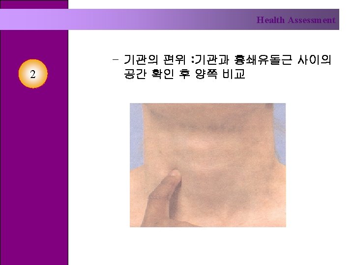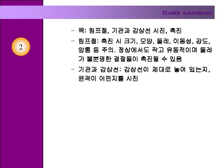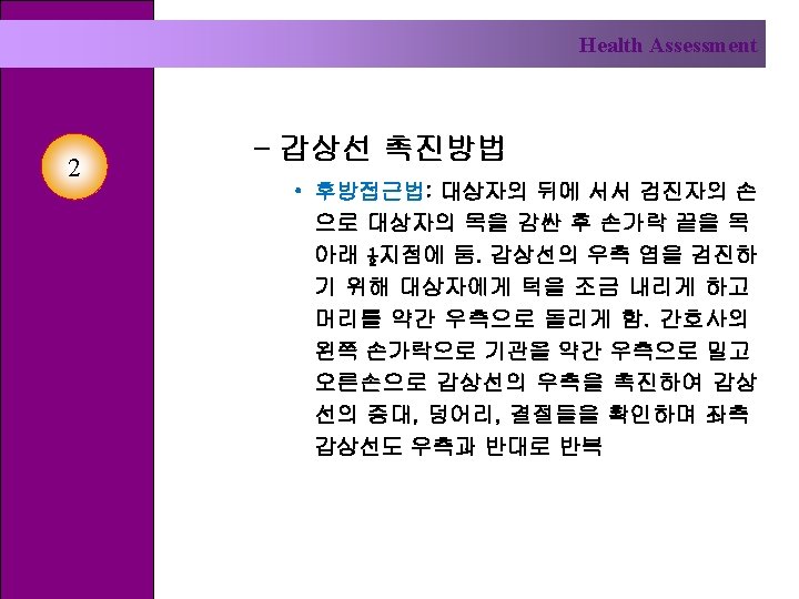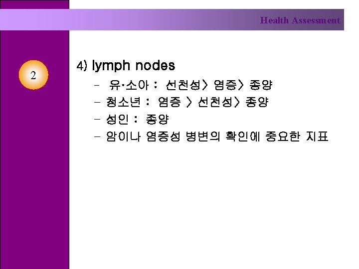 Health Assessment 2 • 인두편도(adenoid, pharyngeal tonsil): 입 천정부 • 귀인두관편도(tubal tonsil): 입 천정부 • 구개편도(palatine tonsil) • 설편도(lingual tonsil)