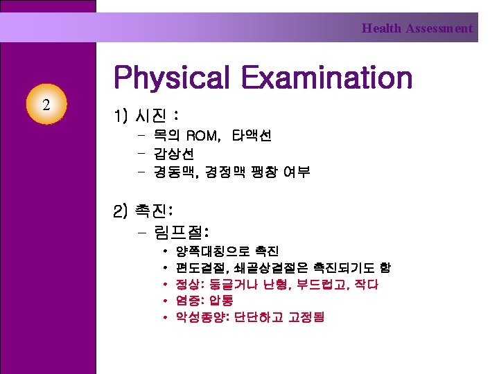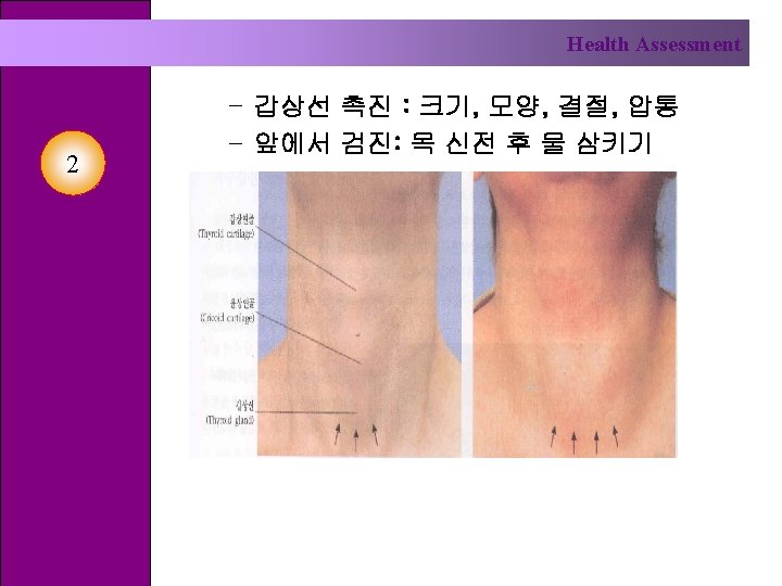 Health Assessment 갑상선 비대 2 산재성 갑상선 비대 (diffuse enlargement) 다결절성 갑상선종 단결절성 갑상선 (multinodular Goiter) (Single Nodule)